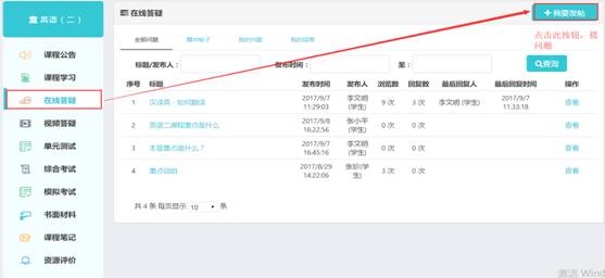 5. 在线答疑。在此可以发帖向老师提问题,课程教师会进行回复,也可以看到其他同学的问题和老师的回复。